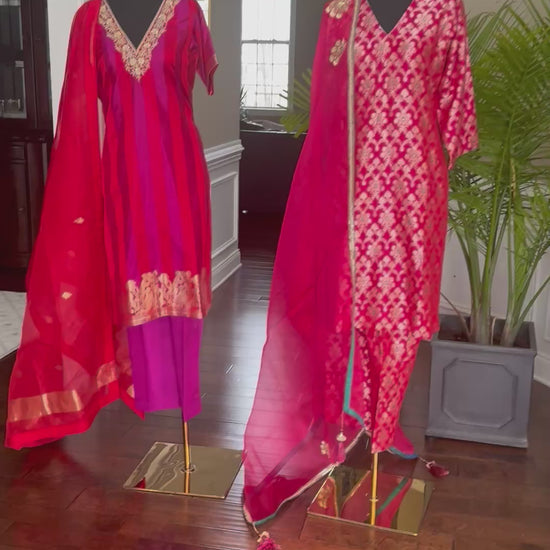Timeless Banarasi katan silk suit featuring traditional woven motifs and elegant craftsmanship. Paired with a pure silk organza dupatta finished with delicate handwork, creating a graceful festive look that feels light yet luxurious.