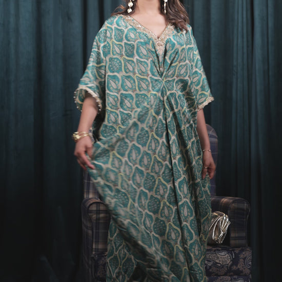 An effortlessly elegant semi-crepe kaftan in rich green, designed with delicate handwork on the neckline and finished with lace detailing on the sleeves. The relaxed free-size silhouette offers both comfort and style, making it a graceful Indian festive kaftan outfit perfect for gatherings and celebrations.